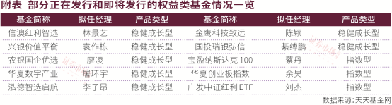 进一步看目前在档发行的产品,去年股票型基金状元陈颖的新作金鹰科技致远混合赫然在列。 在去年末与本刊的深度对话中他曾强调,AI是5到10年以上周期性行情,红利方向机会或在黄金和有色。