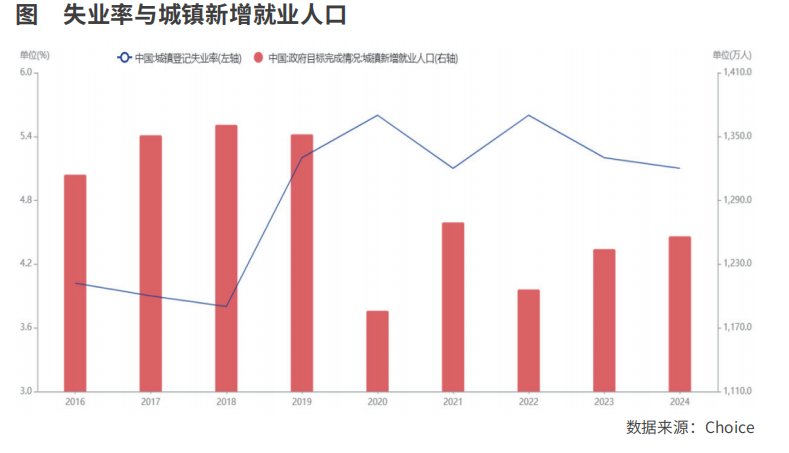 经济增长创造就业的能力保持稳定。“十四五”期间,中国经济实力显著增强,产业结构不断优化,经济发展蛋糕做大做强,为稳就业奠定了基础。根据《证券市场周刊》的测算(年均城镇新增就业人口/年均GDP增长),2021-2024年1个百分点的GDP增长可以创造约225万人的城镇新增就业,与“十三五”期间大致相当。最近几年,中国经济正在进行新旧动能的转换,这一就业结果也表明,以消费为主驱动、科技含量更高的经济发展模式,依然保持着较强的创造就业的能力。