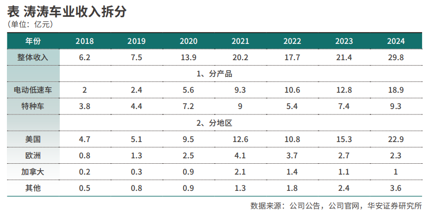 也就是在上市前的2022年下半年,涛涛车业针对市场推出新品电动高尔夫球车,且电动高尔夫球车逐步实现小批量试产。2023年,涛涛车业电动高尔夫球车正式投入市场。凭借公司在北美市场的多年深耕以及全球化产能布局,涛涛车业电动高尔夫球车迅速成为公司收入增长的最大推动力。