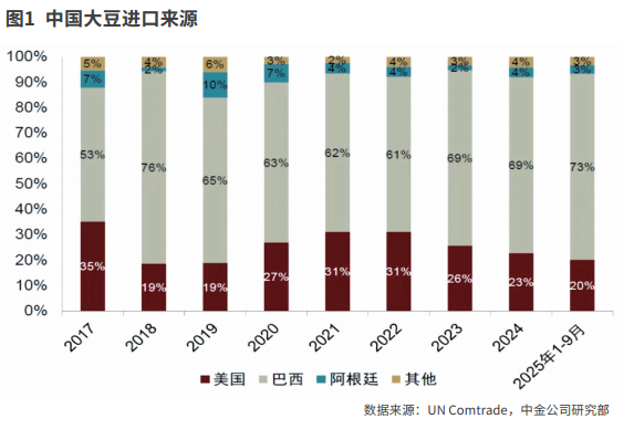 扩大农产品贸易的共识,或将增加中国进口美国的大豆。2022年以来中国从美国进口的大豆占比呈现下降趋势,从巴西进口的大豆占比上升,而且美国大豆对中国的出口依存度较高。根据中金公司的测算,2025年1-9月中国从美国进口的大豆占比20%,较2024年的23%下降3个百分点。2024年美国大豆出口的52%流向中国,其对中国的出口依赖度较高。