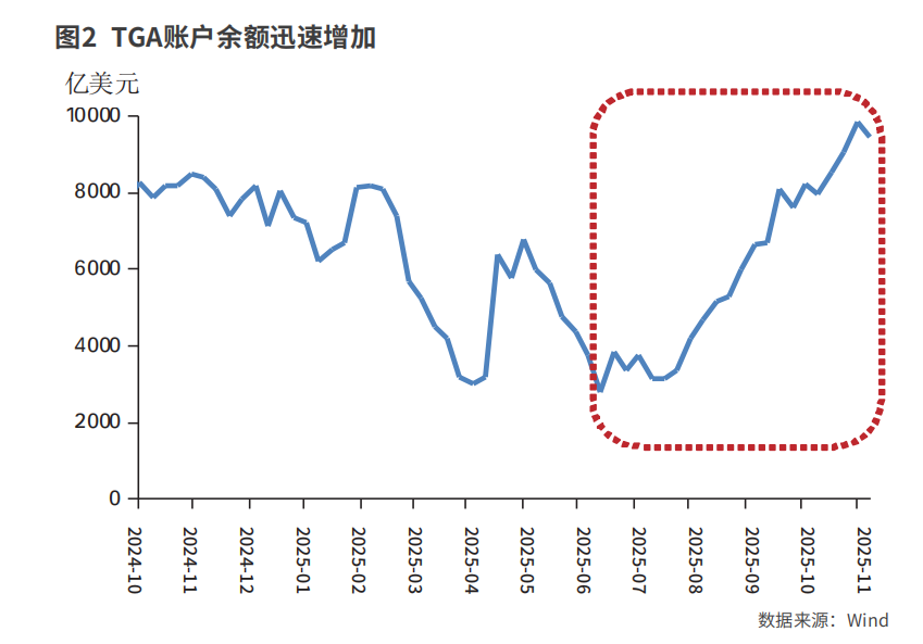 2025年7月,美国通过《“大而美”税收和支出法》,旨在通过大规模减税和财政扩张应对国内经济与国际竞争压力。法案将美国联邦债务上限从36.1万亿美元提高至41.1万亿美元,增加额度达5万亿美元,创历史最大增幅。随着债务上限的上调,美国财政部大量增加短期国债发售,以重建现金储备。更高的国库券发行占比增加债务展期规模,为此需要更高的TGA余额以覆盖未来一周资金流出。据美国财政部测算,国库券占比每提高5%,TGA余额平均会增加900亿美元。因此,7月以来TGA余额迅速上升,银行体系和货币市场可自由使用的流动性相应减少。