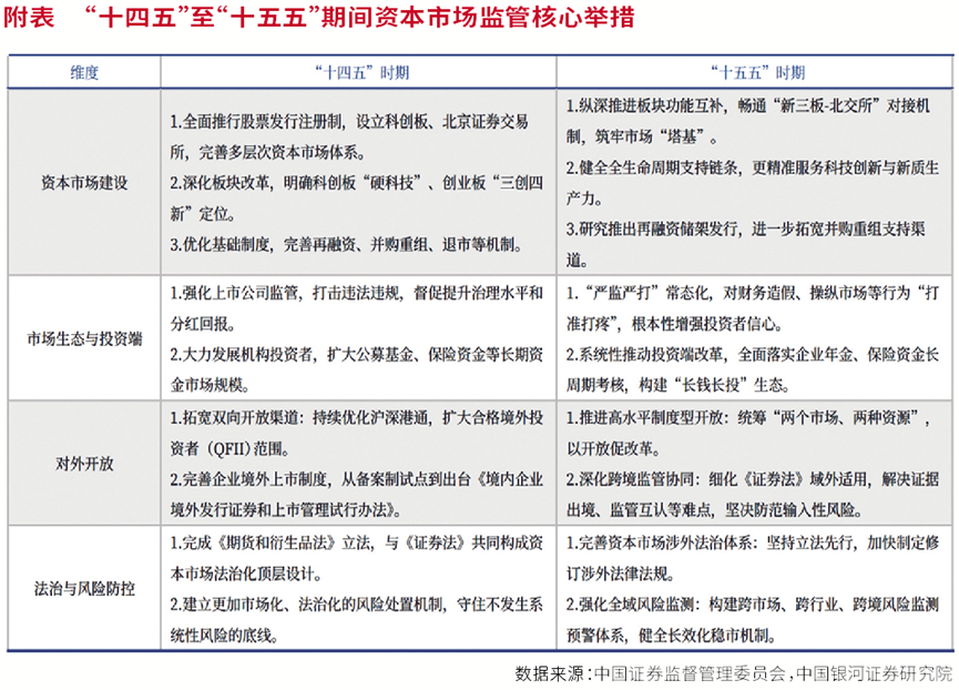 银河证券表示,“十五五”期间,金融监管将持续保持高压态势。聚焦到资本市场,监管层将进一步加强防风险与强监管的统筹发展,强化跨市场、跨行业、跨境风险监测,健全长效化稳市机制,提升违法违规行为打击力度,持续增强投资者信任和信心。