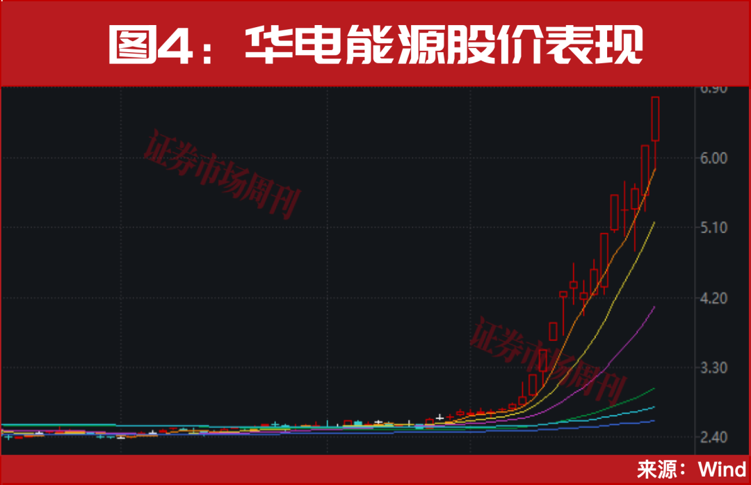 3月以来,算电协同概念被市场热炒,因首次被写入《政府工作报告》,算电协同的市场关注度陡然升温。算电协同既是算力主线的延伸,也是电力主线的逻辑拓展。当下,虽然A股受到外围冲突的压制,但这并没有影响华电辽能、华电能源等人气龙头的强劲表现,2月以来,两只个股均上涨超160%(见图3、图4)。