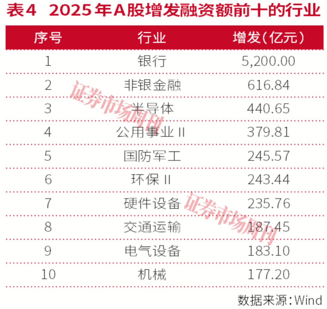 这一趋势在再融资市场得到了同样鲜明甚至更强烈的印证。2021年,定增融资的领头羊是建材Ⅱ、硬件设备、机械等偏重资产和传统制造的行业,半导体位列第五。而到了2025年,剔除银行、非银金融等机构因补充资本金而进行的巨额再融资后,可发现半导体行业的440.65亿元定增规模已悄然跃居实体产业的第一位。
